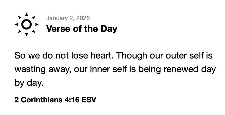 When have you lost heart in God? Things going in the wrong direction at work, at home, in life! C.S. Lewis says that our lives are lived in the Shadowlands, because all of this is a shadow of what God intends for us. God is strengthening our spiritual bodies everyday as we come to know Him in His Word made Flesh, Jesus Christ, and in His Word found in Scripture. As Christians, we are renewed in the Spiritual baptism of the Holy Spirit through the blood of Jesus Christ on the cross. Understanding this reality is the balm that allows us to grow spiritually, even when our physical selves may be diminishing. I find it interesting that it is easy to find a die-hard Steeler fan who NEVER loses heart, even when the team is not doing well, but at the same time, loses heart in God, and actually blames God for all of their misfortunes, regardless of their own culpability and actions. Nevertheless, God’s love for us is so immense and intense, God continually opens His arms to us, and always seeks for us to understand the renewal He offers everyday. Therefore, let us open ourselves to this renewal, especially as we enter 2026. Peace and Blessings!
